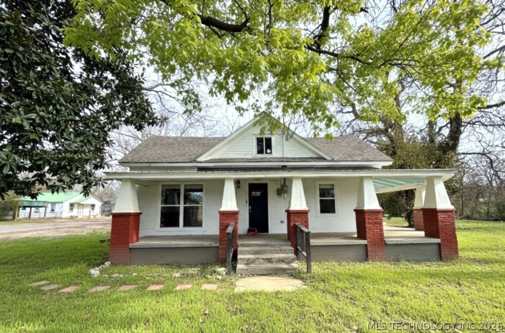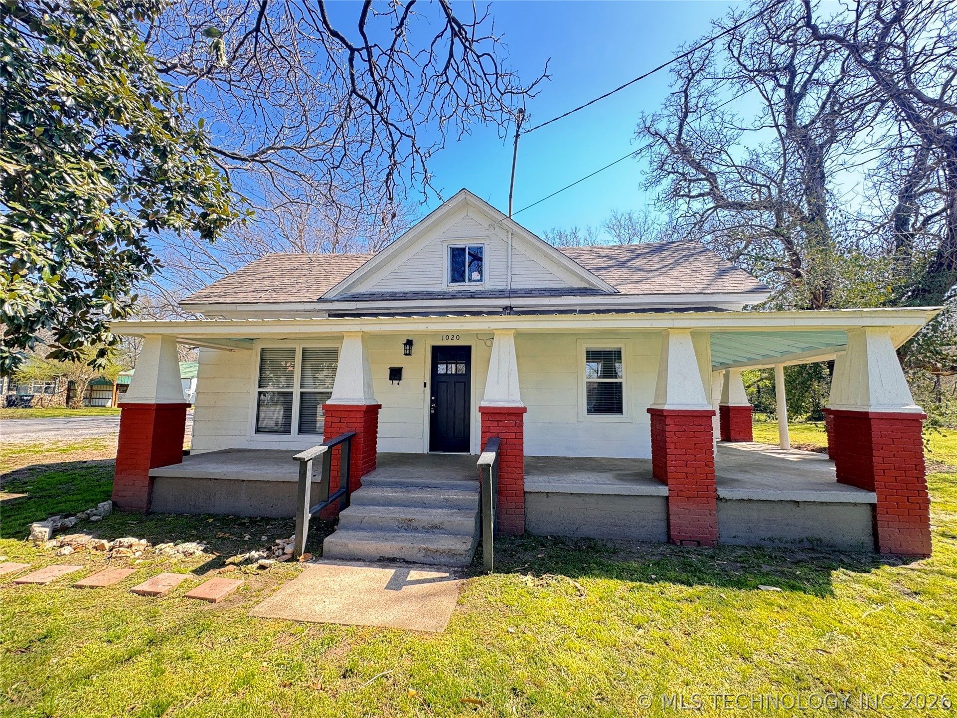 This classic 3-bedroom Craftsman, situated on a sprawling corner lot just minutes from NSU and Downtown Tahlequah, perfectly blends historic soul with modern luxury. The home greets you with an expansive wrap-around porch and opens into a meticulously remodeled interior featuring brand-new flooring, paint, and lighting throughout. You'll find an inviting living room anchored by a decorative fireplace, a flexible formal dining or secondary living space, and a stunning open-concept kitchen equipped with a massive granite island and stainless steel appliances. The main floor hosts a primary suite complete with exterior access, an office nook and laundry space, & the second large, light filled bedroom, while the upper level offers a charming loft with a dormer window reading nook. Do not miss this rare opportunity to own a beautifully updated piece of Tahlequah history in a truly prime location!